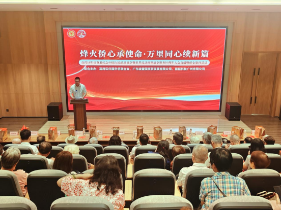 2025年9月3日上午,为纪念中国人民抗日战争暨世界反法西斯战争胜利80周年,弘扬伟大抗战精神与爱国主义精神,广州市荔湾区侨联联合广东波蜜园商贸发展有限公司(以下简称波蜜园公司)、扬韬科技广州有限公司,在1906科技园礼堂,共同举办“烽火侨心承使命 万里同心续新篇——荔湾区归侨观看纪念中国人民抗日战争暨世界反法西斯战争胜利80周年大会直播暨侨企慰问活动”。荔湾区老归侨代表、基层侨联工作骨干、扬韬公司员工代表共100多人齐聚一堂,在庄重热烈的氛围中铭记历史、缅怀先烈,珍爱和平、开创未来。
