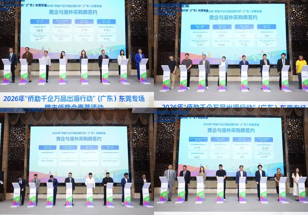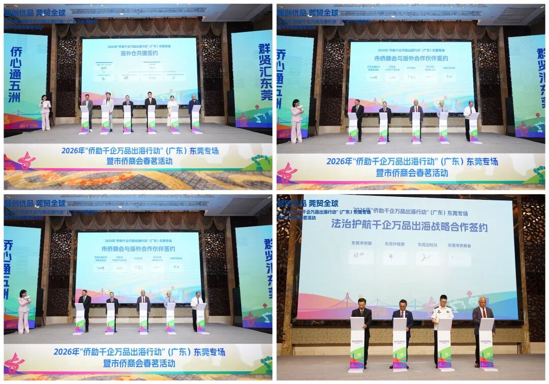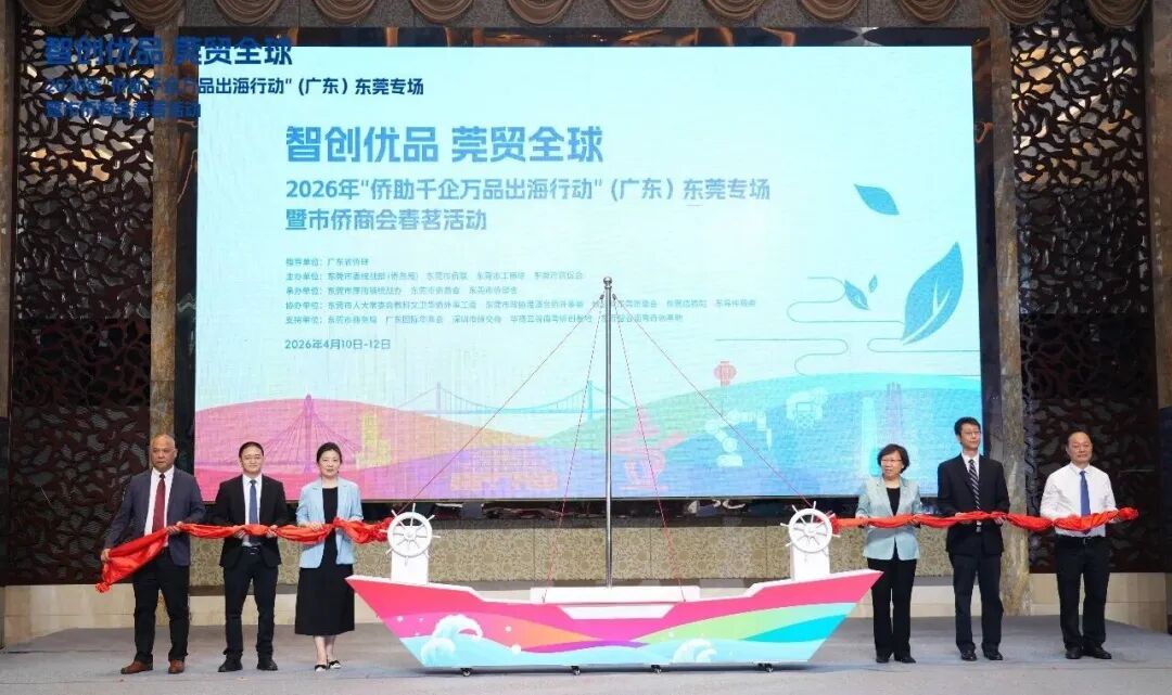智创优品,莞贸全球。4月10日至12日,2026年“侨助千企万品出海行动”(广东)东莞专场暨市侨商会春茗活动在东莞厚街举行。活动由东莞市委统战部(侨务局)、东莞市侨联、东莞市工商联、东莞市贸促会主办,东莞市人大教科文卫华侨外事工作委员会、东莞市政协港澳台侨外事委员会、致公党东莞市委会、东莞边检站、东莞仲裁委协办。来自马来西亚、柬埔寨、越南、阿联酋、巴西、法国、德国、意大利等20多个国家和地区的海外侨商侨领代表、东莞政企代表近300人参加。广东省侨联党组成员、副主席邵瑾,东莞市政协党组副书记、副主席、一级巡视员喻丽君出席启动仪式并致辞。活动现场达成14项签约合作,采购意向金额达21.4亿元,创下该行动开展以来单场活动签约金额新高,成为东莞深化对外开放、推动“智创优品”走向世界的又一重要实践。