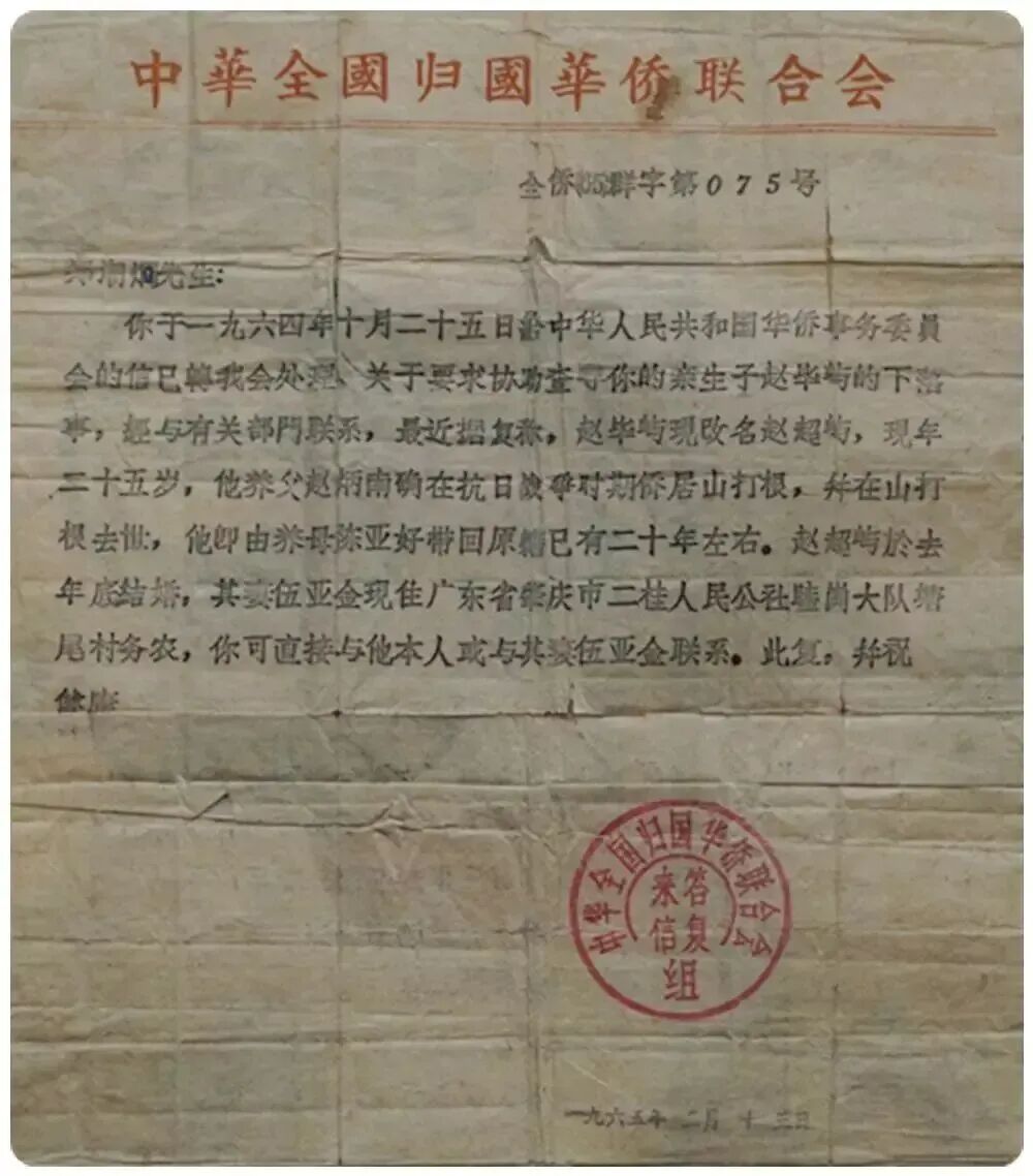 四月侨乡美如画,海外游子喜还乡。今年4月10日至12日,新会籍新加坡抗战爱国华侨郑潮炯先生亲友家乡访问团一行7人回到家乡广东江门参观访问、祭祖探亲。4月10日上午,访问团一行首站到访江门市侨联。受到江门市侨联主席林春晖、副主席余泽权等领导的热情接待。 郑潮炯先生亲友家乡访问团成员包括:郑社心先生(郑潮炯二儿子、新加坡华人、今年92岁),冯丽卿女士(郑社心夫人、郑潮炯二儿媳、新加坡华人),郑宇嫣(郑社心孙女、郑潮炯曾孙女、新加坡华人),郑锦龙(郑潮炯先生侄子),郑维雄(郑潮炯侄孙),赵沛荣(郑潮炯曾孙子、郑社义孙子)以及赵惠珍(郑潮炯孙女、郑社义女儿)等。 座谈会上,郑社心老先生愉快畅谈回乡感受,高度评价家乡江门五邑日新月异的变化和发展,他也回顾了去年与梁红武常委、林春晖主席畅聚家乡的深厚情谊。江门市侨联主席林春晖向新加坡乡亲们转达了江门市委常委、统战部长梁红武同志的亲切问候和美好祝福,期望郑潮炯先生亲友家乡访问团成员一如既往关心支持家乡建设与发展,继续发扬和弘扬郑潮炯先生“有国才有家”的家风家教和爱国主义精神,在海外传播和讲好江门故事、湾区故事和中国故事。在江门市侨联访问期间,郑社心先生一行参观了市侨联侨胞之家及侨联专题展。郑社心、郑维雄、赵沛荣等还接受了江门电视台记者的专访。 据介绍,抗战爱国志士郑潮炯(1904—1984),广东新会人,自幼随父到马来亚谋生。抗战爆发后,郑潮炯义无反顾地开始了义卖瓜子筹款活动,他虽然没有万贯家财,但他有共赴国难的意志,决心义卖到胜利为止,以实际行动支援祖国抗战事业。他肩跨义卖袋,奔走于马来亚和新加坡的每一所华侨学校、商铺和剧院,沿街挨家挨户义卖瓜子,筹得义款全部捐给南洋华侨筹赈总会。更让人惊叹的是,为了筹得更多的义款,郑潮炯将自己刚出生40天的儿子以80元的价格,“卖”给了马来西亚的一位肇庆籍华侨商人,并把这80元全部捐给了南洋华侨筹赈总会。郑潮炯“鬻子救国”的壮举在南洋侨界造成极大轰动效应,感动了无数侨胞,也在广大的南洋侨胞中掀起了积极为祖国抗战捐款的热潮。 后人接棒,传扬好家风。爱国华侨郑潮炯先生后人一直以来继承和发扬好家风,以不同的方式支持祖国和家乡的各项事业。2016年4月6日,中国华侨历史博物馆举行了郑潮炯相关物品接受捐赠仪式。捐赠仪式由中国华侨历史博物馆馆长黄纪凯主持。中国侨联副主席李卓彬先生、新加坡华人郑社心先生、郑锦龙先生、郑维雄先生以及新加坡冈州会馆谢永基先生出席仪式。此次捐赠物品主要有:郑潮炯义卖瓜子筹款所用挂袋、郑潮炯筹款所穿衣服、郑潮炯捐款收据、郑潮炯的华侨登记证等相关物品资料。其中最珍贵的是1965年中华全国归国华侨联合会找到郑潮炯失散多年的儿子后给郑潮炯先生的回信。这些珍贵的侨史文物由郑潮炯先生后人捐赠给中国华侨历史博物馆永久珍藏。(江门市侨媒中心:黄柏军、宋俏宜/摄影报道) 珍贵侨史文物。图为1965年中华全国归国华侨联合会给郑潮炯的回信