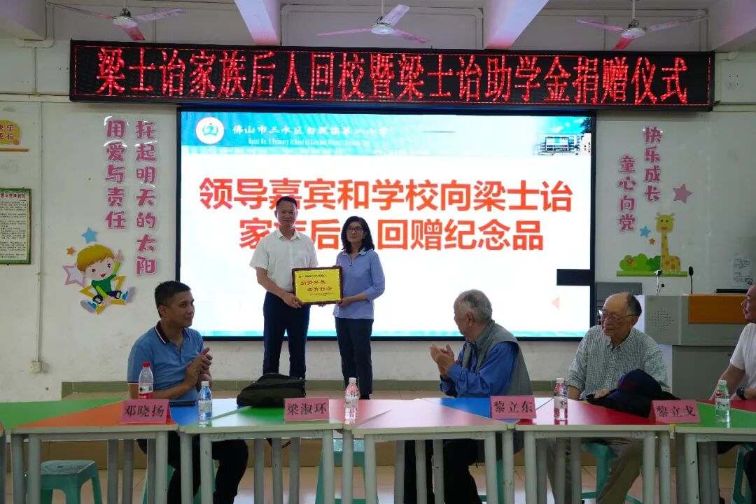 梁士诒家族后人一行在学校合照。 梁士诒家族后人与学生们在学校操场合照。 在白坭镇第二小学,“梁士诒家族后人回校暨梁士诒助学金捐赠仪式”简朴而隆重举行。梁士诒家族代表向学校捐赠37万元助学基金,专项支持学校教育事业发展。家族后人表示,教育是兴乡之基,此次捐赠是传承先辈造福乡梓精神,愿助力学子成长,鼓励他们学有所成、回报家乡。学校负责人对家族后人的善举表示衷心感谢,并表示将用好爱心基金,用心育人,培养更多优秀学子。 捐赠仪式后,家族一行前往三巷村实地参观,亲眼见证家乡在乡村振兴、文化传承、环境提升等方面取得的崭新变化,倍感欣慰与自豪。此行,梁氏后人还到梁士诒生祠等地进行缅怀,用一场短暂的停留,完成跨越时空的对话。 三水区委统战部、区侨联向梁士诒家族后人赠送佛山醒狮文创纪念品。 三水区白坭镇回赠牌匾给梁士诒家族后人。 如今的白坭镇第二小学,与三水著名政治人物梁士诒有着深厚的历史渊源。早在1908年,梁士诒便与父亲梁知鉴在岗头村大祠堂创办劝学所;1910 年,他又在家乡岗头村创立岗头职业学校;1918年,他将劝学所更名为琼冈高等小学,推行西式教学、免收学费,惠及乡里。该校历经三达学校、岗头小学等沿革,最终于2003年与周边六校合并,成为今天的白坭镇第二小学。 梁士诒家族后人一行参观和听取白坭镇第二小学发展历程。 此次返乡之行,既是一次深情的缅怀,更是一份爱心接力与使命延续。梁士诒家族后人以捐资助学的实际行动传承先贤精神、厚植家国情怀,为家乡教育事业注入了温暖力量。