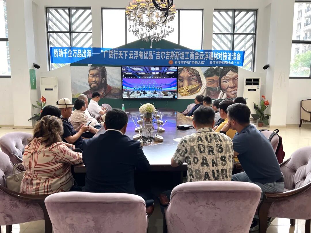 考察团一行首先来到云浮市侨联“侨胞之家”,召开侨助千企万品出海——“广货行天下 云浮有优品”吉尔吉斯斯坦工商会云浮建材对接洽谈会。会上,双方共同观看了《云浮是个好地方》城市宣传片,全面了解云浮的区位优势、产业特色和营商环境。“侨胞之家”相关负责人向考察团详细介绍了云浮绿色建材、智能家居、石材加工等优势产业的发展现状,并与吉方代表就产品标准、物流通道、跨境结算等实务问题展开深入交流。